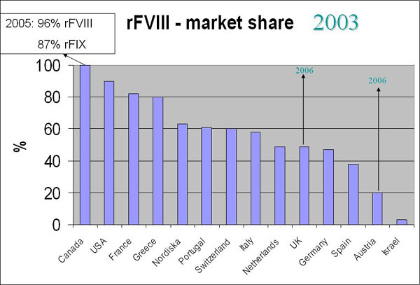 כיום עובר העולם המערבי כולו לשימוש בתכשירים רקומביננטים. בשנת 1999 היווה פקטור 8 רקומביננטי כ-75% מהשוק בטיפול בהמופיליה A בארצות הברית, בצרפת ובשוודיה, ופקטור 9 רקומביננטי היווה כ-85% מהשוק בצפון אמריקה.