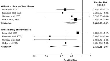 One of the case-control studies included in this meta-analysis employed 3 different control groups.27 In that study, results based on community controls and a control group with chronic liver disease (chronic hepatitis or cirrhosis), but not hospital-based controls, showed that coffee drinking during the last 1-2 years and 10 years before was significantly inversely associated with the risk of HCC, even after adjustment for hepatitis virus markers (in analysis with liver disease patients as control group).27