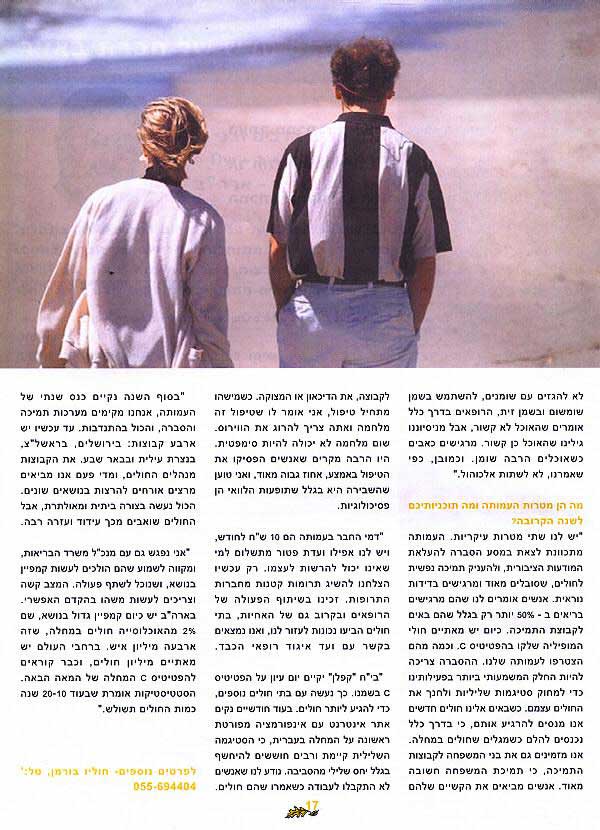 הערת מערכת אתר המופיליה: הכתבה שהופיע בזמנו במעריב היתה נכונה לתאריך בו נכתבה. החל משנת 2005 התרופה פג-אינטרפרון הנזכרת בכתבה, נכנסה לסל התרופות, לטיפול ל-48 שבועות בלבד. מקובל בספרות הרפואית להאריך את הטיפול, למי שבעיתו לא נפתרה, וכן לעשות טיפולים חוזרים במקרים מסוימים. לכך עדיין אין פיתרון וחולים אלו מופקרים לגורלם.