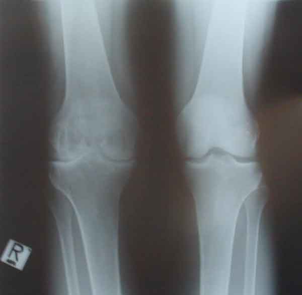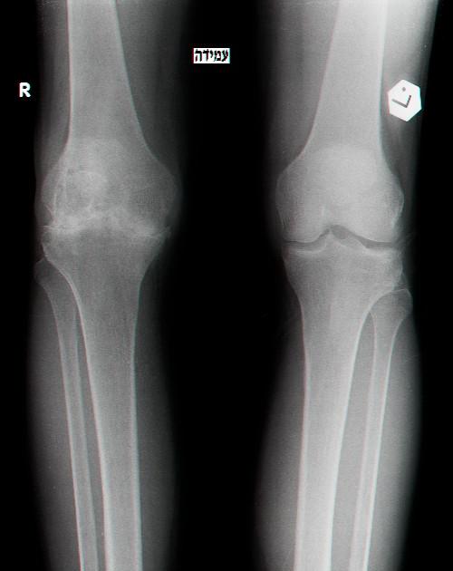 אותם ברכיים לאחר 15 שנים. שים לב שהסחוס בברך הימנית נשחק באופן קשה-החולה סובל מכאב בכל תנועה של הברך