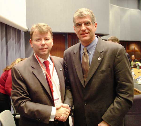 [Photo caption : WFH president, Mark Skinner (right), is congratulated by